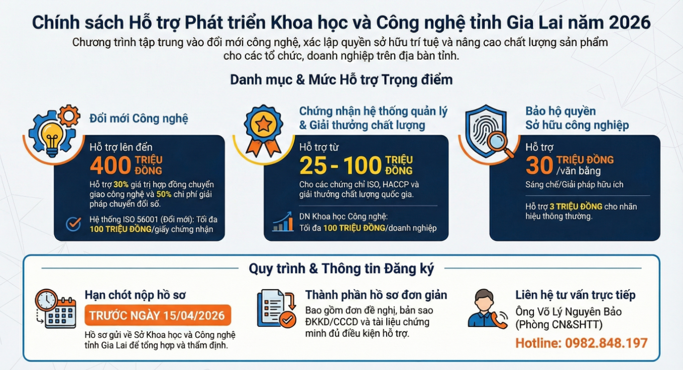 Sở Khoa học và Công nghệ tỉnh Gia Lai ban hành thông báo về việc triển khai các chính sách hỗ trợ phát triển khoa học và công nghệ dành cho các tổ chức, doanh nghiệp và cá nhân trên địa bàn Tỉnh trong năm 2026. Văn bản hướng dẫn chi tiết về các danh mục được thụ hưởng kinh phí như: đổi mới công nghệ, chuyển đổi số, xác lập quyền sở hữu công nghiệp và xây dựng các hệ thống quản lý chất lượng theo tiêu chuẩn quốc tế.