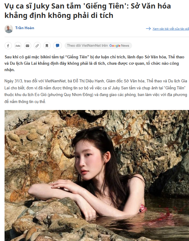 Trước đó, trên mạng xã hội xuất hiện bộ ảnh nữ ca sĩ Juky San mặc bikini tắm và chụp ảnh tại “Giếng Tiên”, khiến dư luận xôn xao.