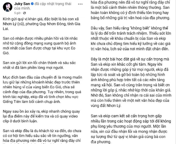 Giám đốc Sở Văn hóa, Thể thao và Du lịch Gia Lai thông tin, sau khi vụ việc xảy ra, ca sĩ Juky San đã thiện chí lên tiếng xin lỗi khán giả và người dân địa phương vì sự cố ngoài ý muốn.