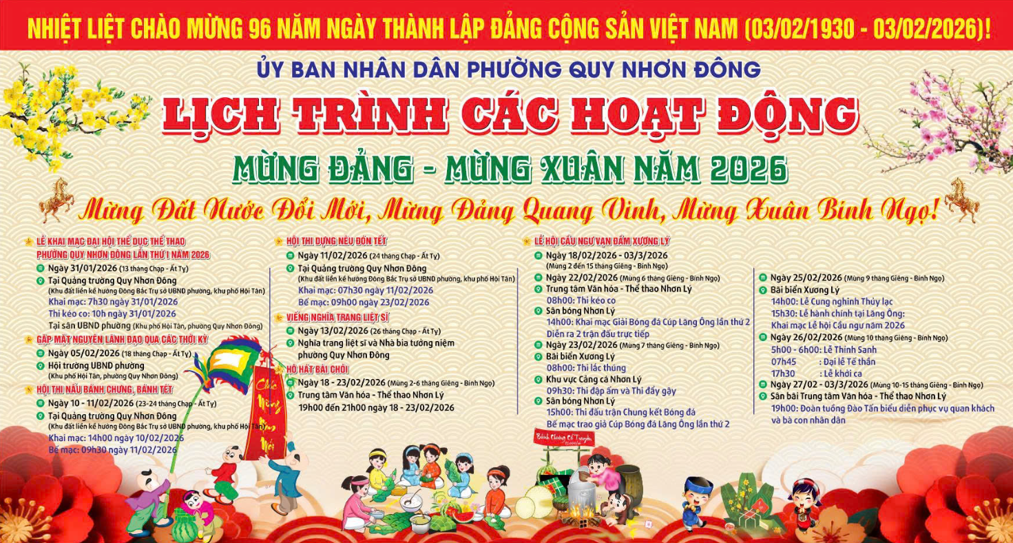 Thực hiện Kế hoạch số 32/KH-UBND ngày 23/01/2026 của UBND phường Quy Nhơn Đông về việc tổ chức Đại hội Thể dục thể thao (TDTT) phường lần thứ I năm 2026, Ban Tổ chức Đại hội TDTT phường đã ban hành Kế hoạch số 37/KH-BTC ngày 27/01/2026 về việc tổ chức Lễ Khai mạc và Bế mạc Đại hội. Đây là sự kiện chính trị - văn hóa - thể thao có ý nghĩa quan trọng, góp phần tạo không khí thi đua sôi nổi, phấn khởi trong các tầng lớp Nhân dân trên địa bàn phường.