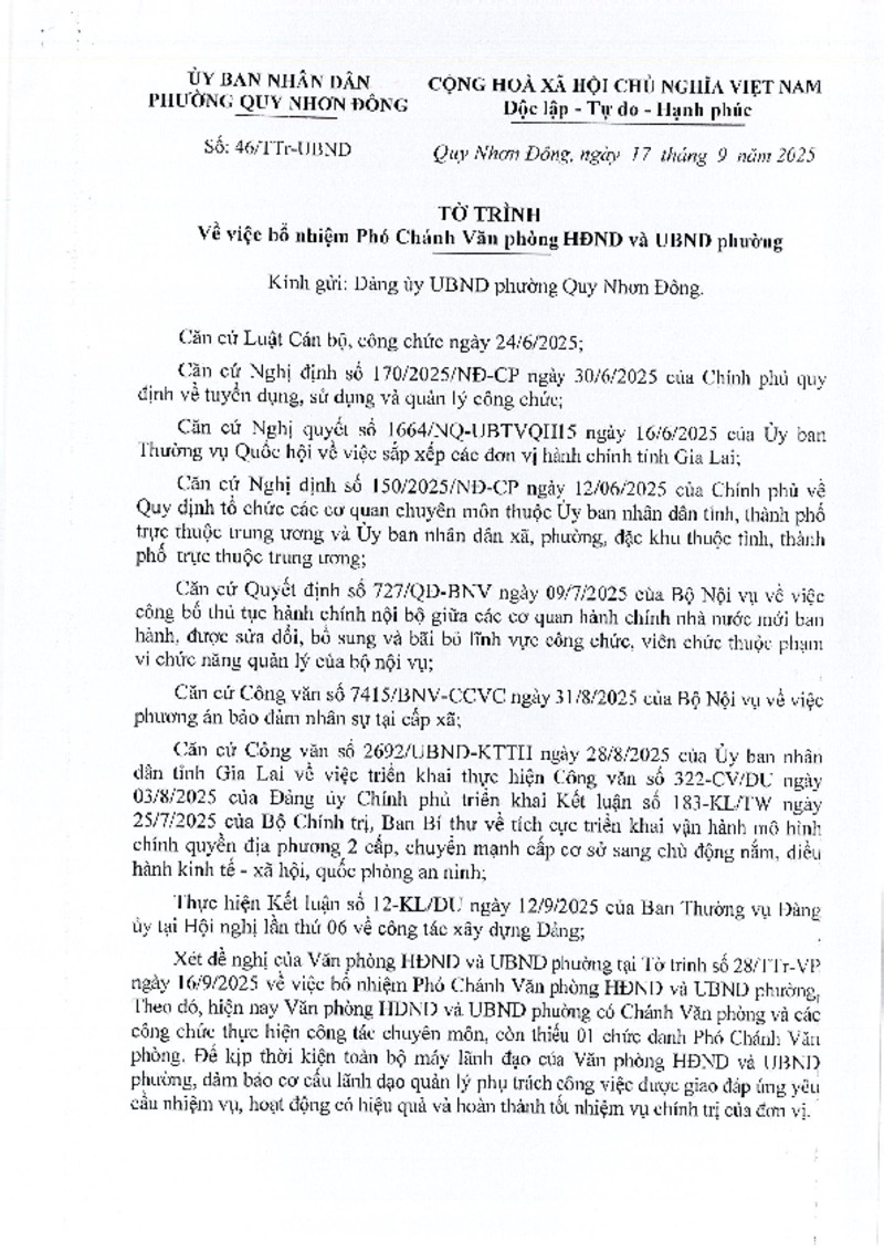Tiêu đề văn bản | Tờ trình về việc bổ nhiệm phó chánh văn phòng HĐND Và UBND phường | ||