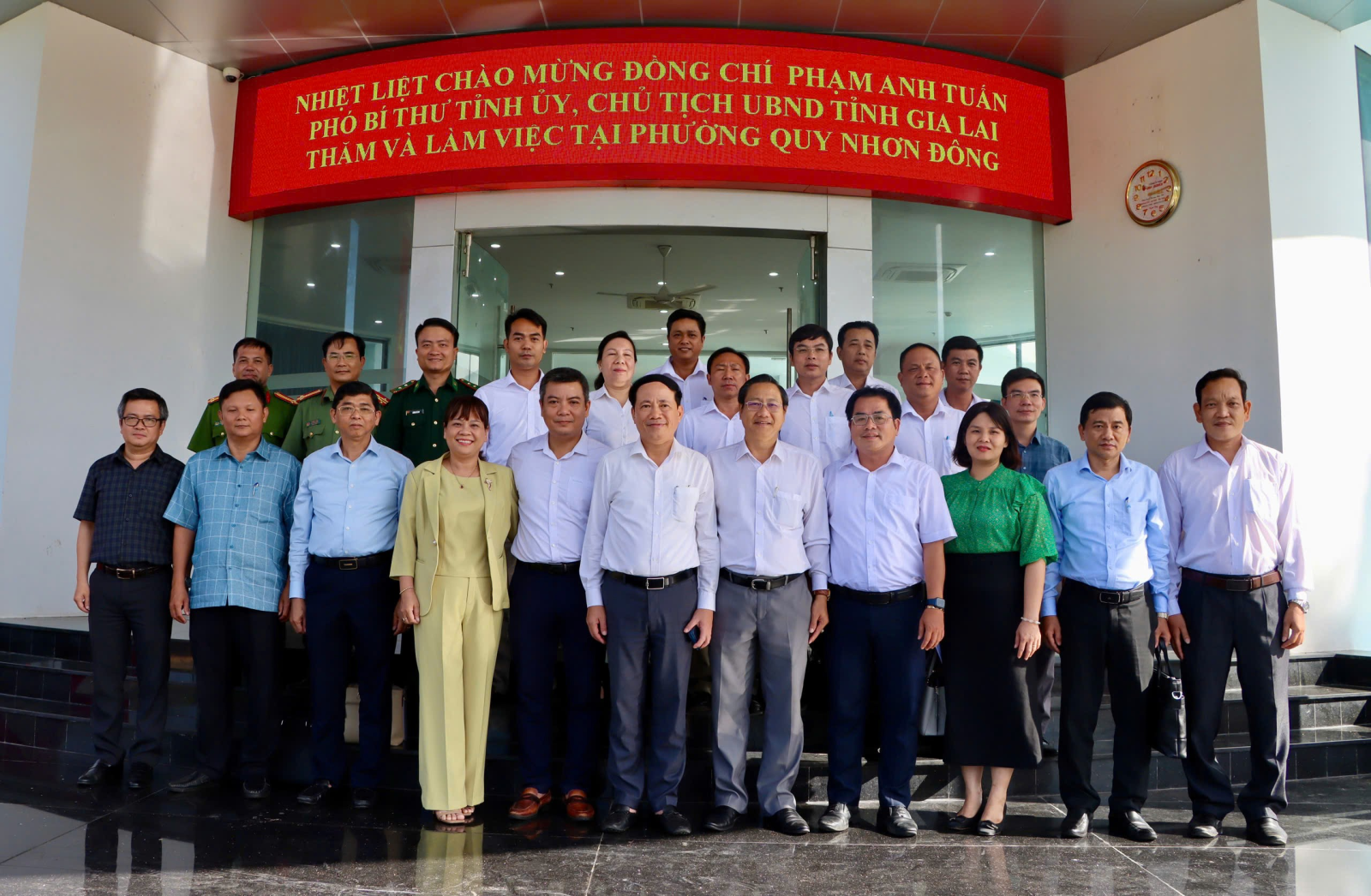 Đồng chí Phạm Anh Tuấn – Phó Bí thư Tỉnh ủy, Chủ tịch UBND tỉnh cùng lãnh đạo sở, ngành chụp hình lưu niệm với lãnh đạo phường Quy Nhơn Đông