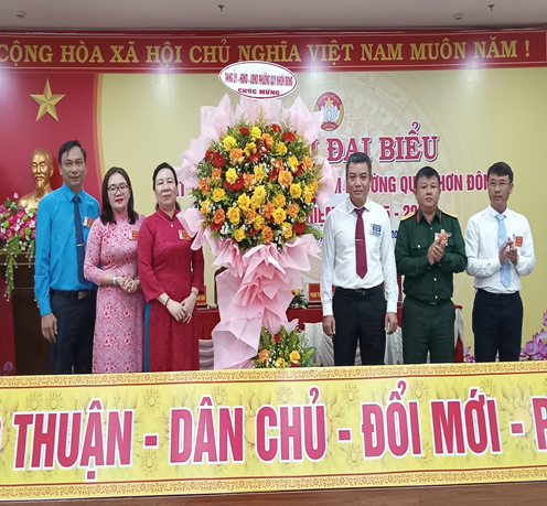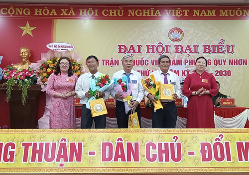 Lãnh đạo Ủy ban MTTQ Việt Nam phường Quy Nhơn Đông tặng hoa cho các đồng chí