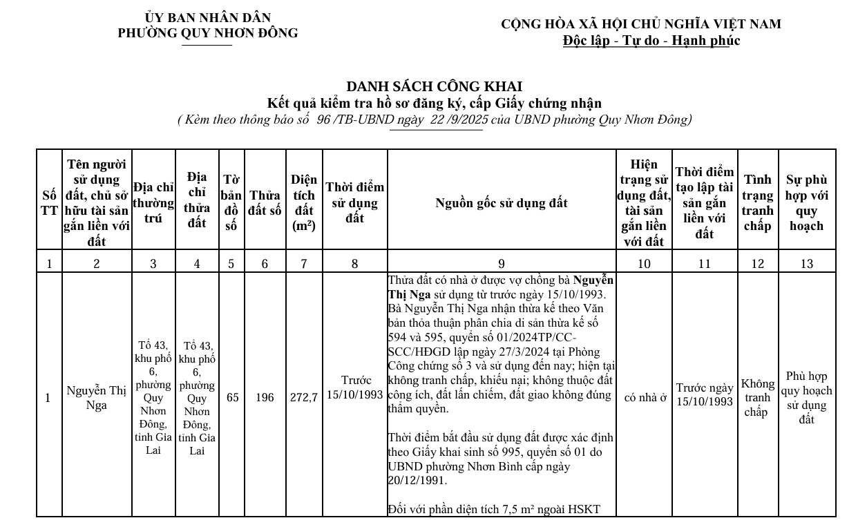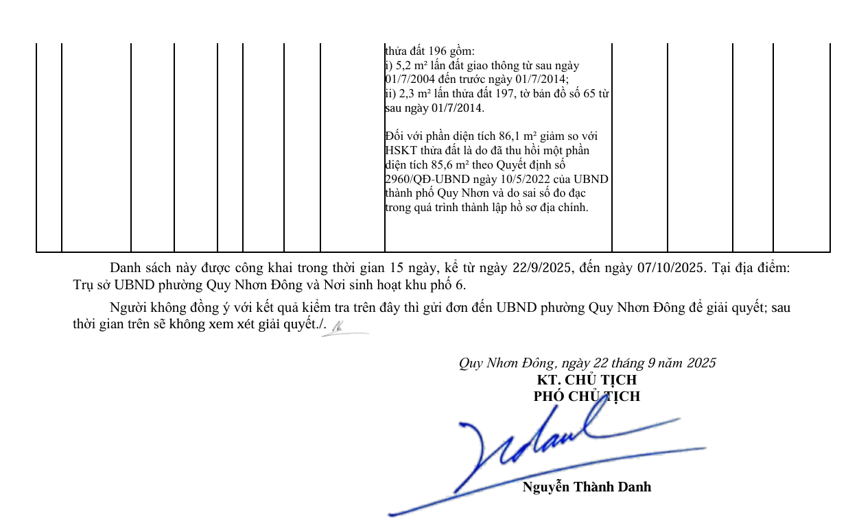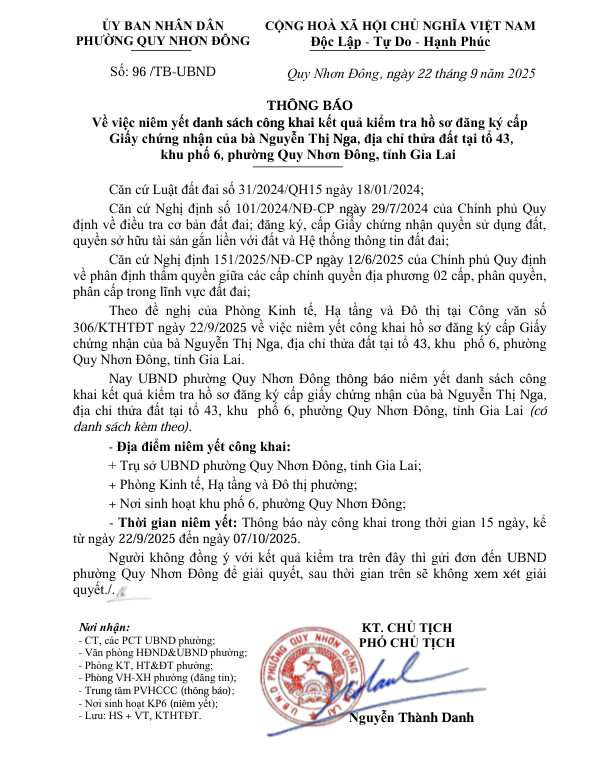 Thứ ba, 23/09/2025 | 16:03 A- A A+ | THÔNG BÁO Về việc niêm yết danh sách công khai kết quả kiểm tra hồ sơ ĐK cấp GCN của bà Nguyễn Thị Nga, thửa đất tại tổ 43 KP6, phường Quy Nhơn Đông, tỉnh Gia Lai Chia sẻ Đọc bài Lưu