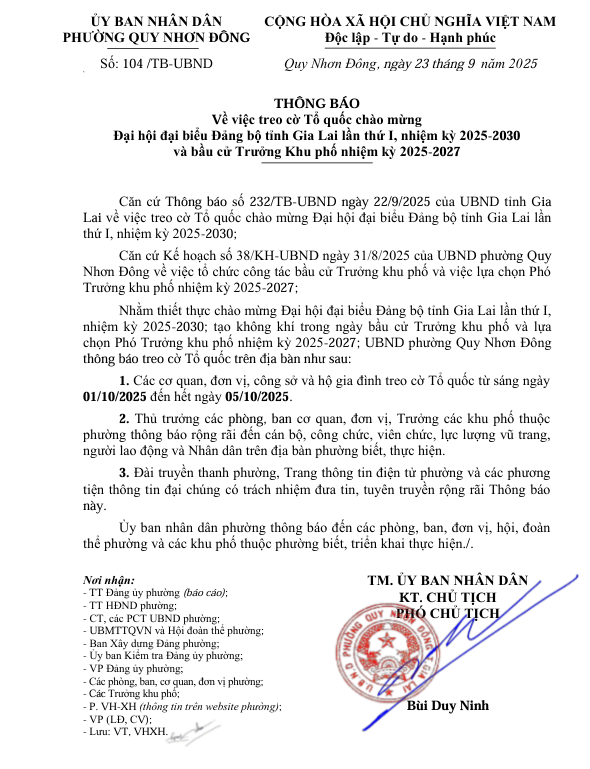 Thứ năm, 25/09/2025 | 09:25 A- A A+ | THÔNG BÁO Về việc treo cờ Tổ quốc chào mừng Đại hội đại biểu Đảng bộ tỉnh Gia Lai lần thứ I, nhiệm kỳ 2025-2030 và bầu cử Trưởng Khu phố nhiệm kỳ 2025-2027 Chia sẻ Đọc bài Lưu Tập tin đính kèm Trình duyệt không hỗ trợ iframe.