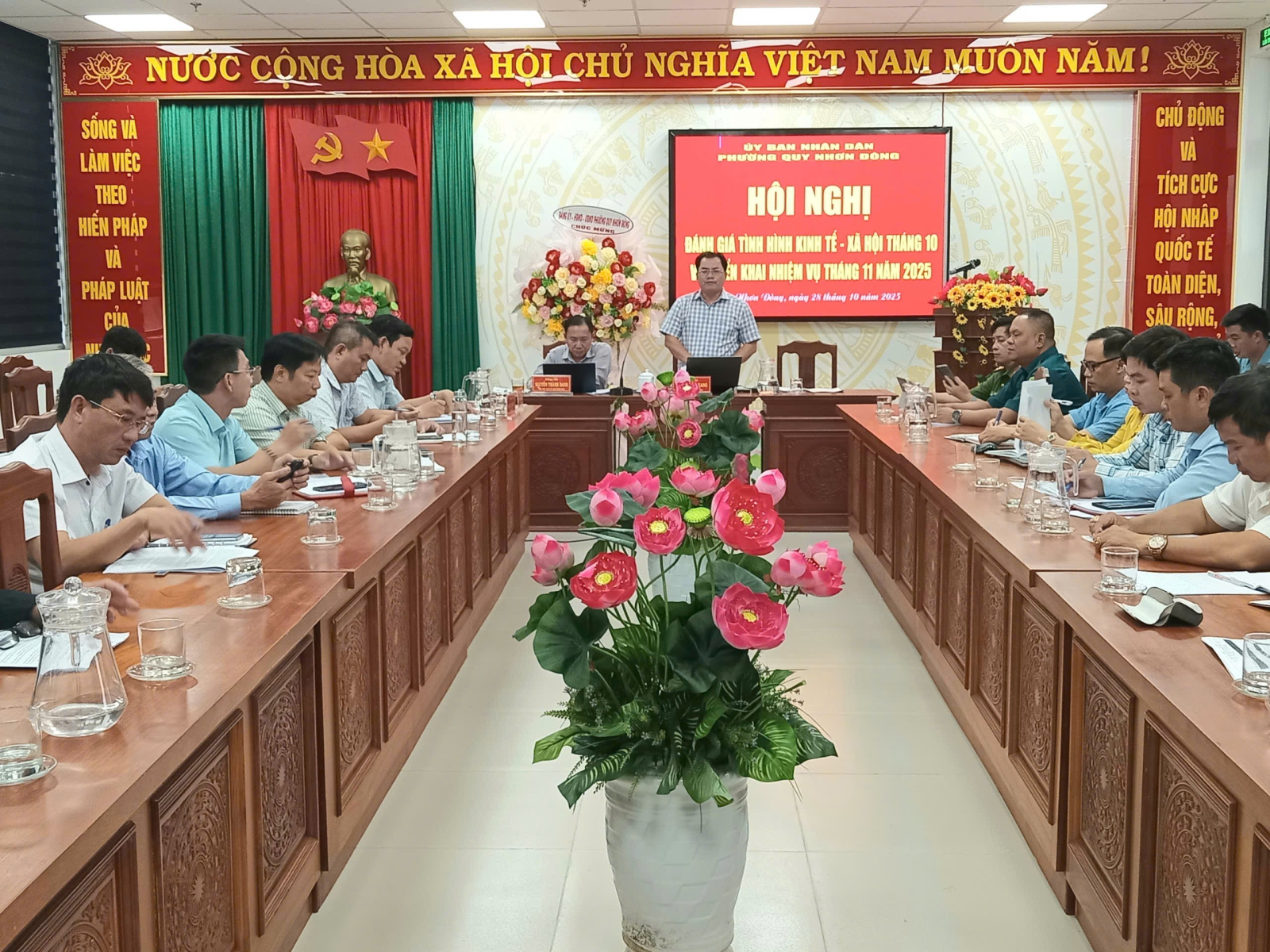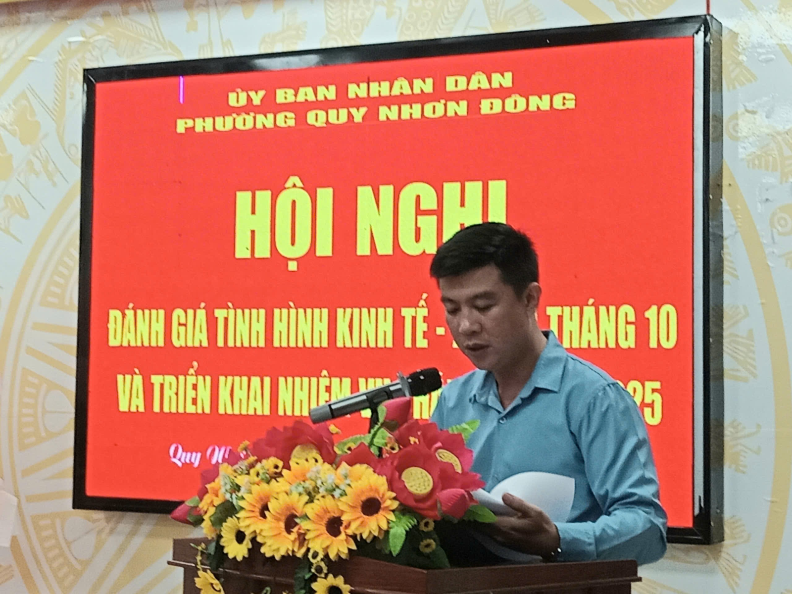Sáng 28/10, tại Phòng họp 1 phường Quy Nhơn Đông, UBND phường tổ chức Hội nghị đánh giá tình hình kinh tế - xã hội, quốc phòng - an ninh tháng 10; triển khai nhiệm vụ trọng tâm tháng 11. Chủ trì hội nghị có đồng chí Trần Việt Quang - Phó Bí thư Đảng ủy, Chủ tịch UBND phường và đồng chí Nguyễn Thành Danh - Ủy viên BTV Đảng ủy, Phó Chủ tịch Thường trực UBND phường và đồng chí Nguyễn Văn Nghĩa - Ủy viên BTV Đảng ủy, Phó Chủ tịch HĐND phường cùng các lãnh đạo các phòng, ban, đơn vị thuộc phường; đại diện Thuế cơ sở 1- tỉnh Gia Lai và Khu phố Trưởng 19 khu phố.