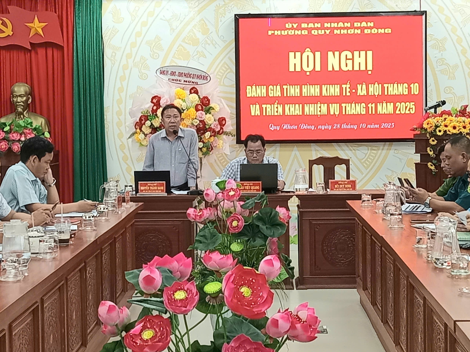 Theo báo cáo, trong tháng 10, UBND phường Quy Nhơn Đông đã tập trung chỉ đạo, điều hành quyết liệt và triển khai thực hiện các nhiệm vụ phát triển kinh tế - xã hội theo kế hoạch đề ra. Theo đó, tổng thu ngân sách nhà nước trên địa bàn phường tháng 10 ước đạt 7 tỷ 330 triệu đồng, lũy kế 10 tháng ước đạt 157 tỷ 705 triệu đồng/68 tỷ 084 triệu đồng, đạt tỷ lệ 231,6% so với kế hoạch năm 2025; cấp giấy chứng nhận đăng ký kinh doanh cho 21 hộ; Tăng cường triển khai các hoạt động thực hiện công tác chống khai thác hải sản bất hợp pháp (IUU); qua công tác tuyên truyền, vận động, đến nay đã có 47/60 tàu đã hoàn thiện hồ sơ, thủ tục theo quy định; kiện toàn Ban Chỉ huy và Tổ giúp việc Phòng thủ dân sự phường, thành lập 19 Tổ xung kích phòng, chống thiên tai tại các khu phố nhằm đảm bảo lực lượng, phương tiện sẵn sàng ứng phó kịp thời khi có tình huống thiên tai xảy ra. Tập trung triển khai công tác thu hút đầu tư trên địa bàn; thực hiện phê duyệt phương án bồi thường, hỗ trợ, tái định cư cho các dự án; Tập trung triển khai GPMB dự án KDC B2 phía Bắc sông Hà Thanh - Nhơn Bình; Tập trung triển khai đẩy nhanh tiến độ thực hiện công tác bồi thường GPMB, thi công các dự án dở dang chuyển tiếp từ thành phố Quy Nhơn (cũ) về địa phương. Trong tháng 10, Trung tâm hành chính công phường đã tiếp nhận 1.080 hồ sơ nộp trực tuyến, Hồ sơ từ kỳ trước chuyển qua 147 hồ sơ, đã xử lý và trả kết quả 1.035 hồ sơ, Trả đúng và trước hạ: 1.015 hồ sơ, đạt tỷ lệ 98,1%. Lĩnh vực văn hóa - xã hội đạt được nhiều kết quả quan trọng; quốc phòng, an ninh chính trị, trật tự an toàn xã hội trên địa bàn được giữ vững.