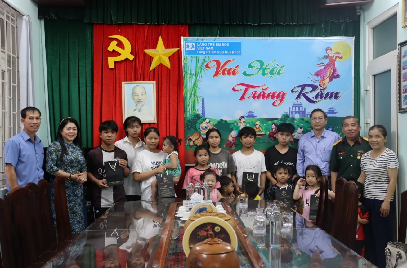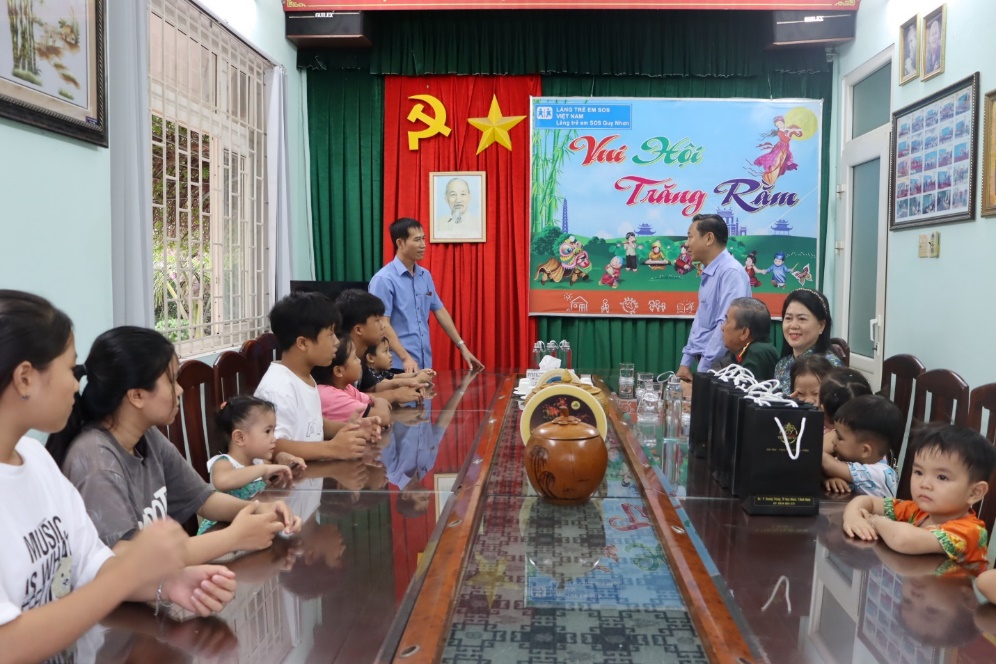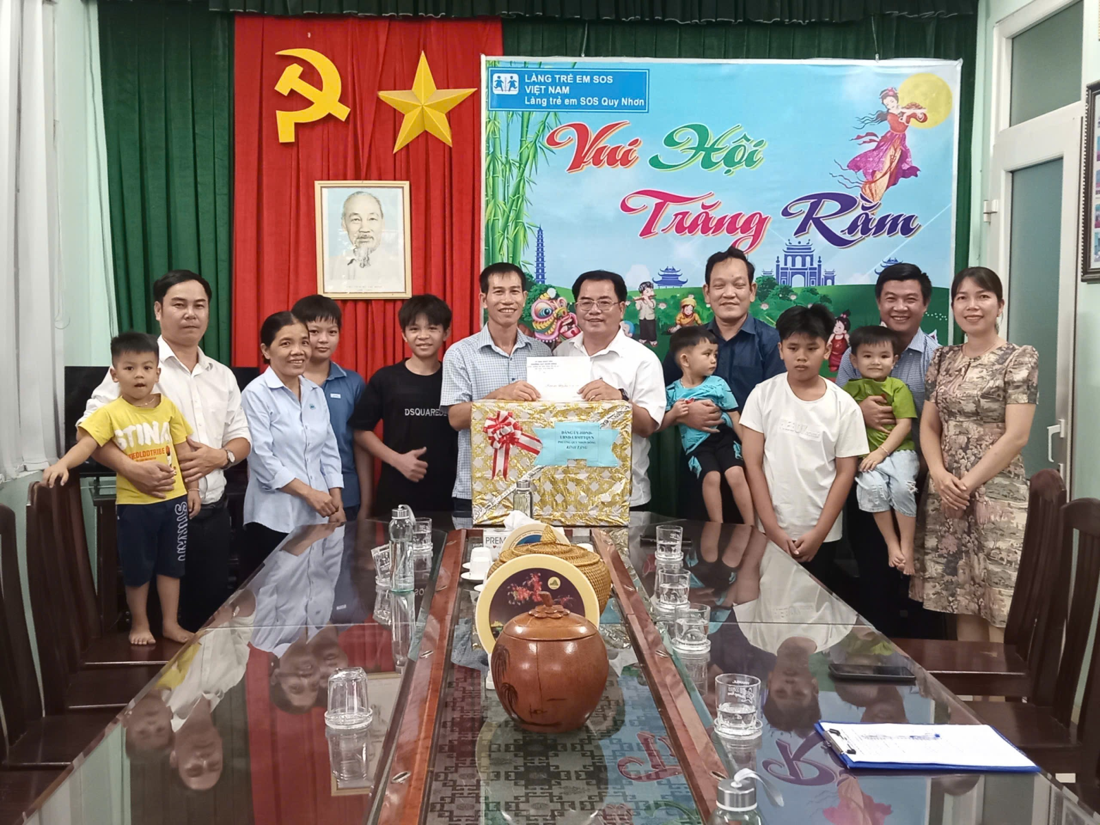 Phó Bí thư Thường trực Đảng ủy phường Quy Nhơn Đông Đỗ Văn Định (thứ 3 từ phải sang) tặng quà trung thu tại Làng trẻ em SOS Quy Nhơn