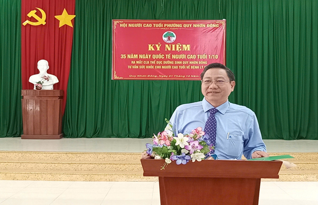 Đồng chí Đỗ Văn Định, Phó Bí thư Thường trực Đảng ủy phường Quy Nhơn Đông phát biểu tại lễ ra mắt Câu lạc bộ người cao tuổi phường Quy Nhơn Đông