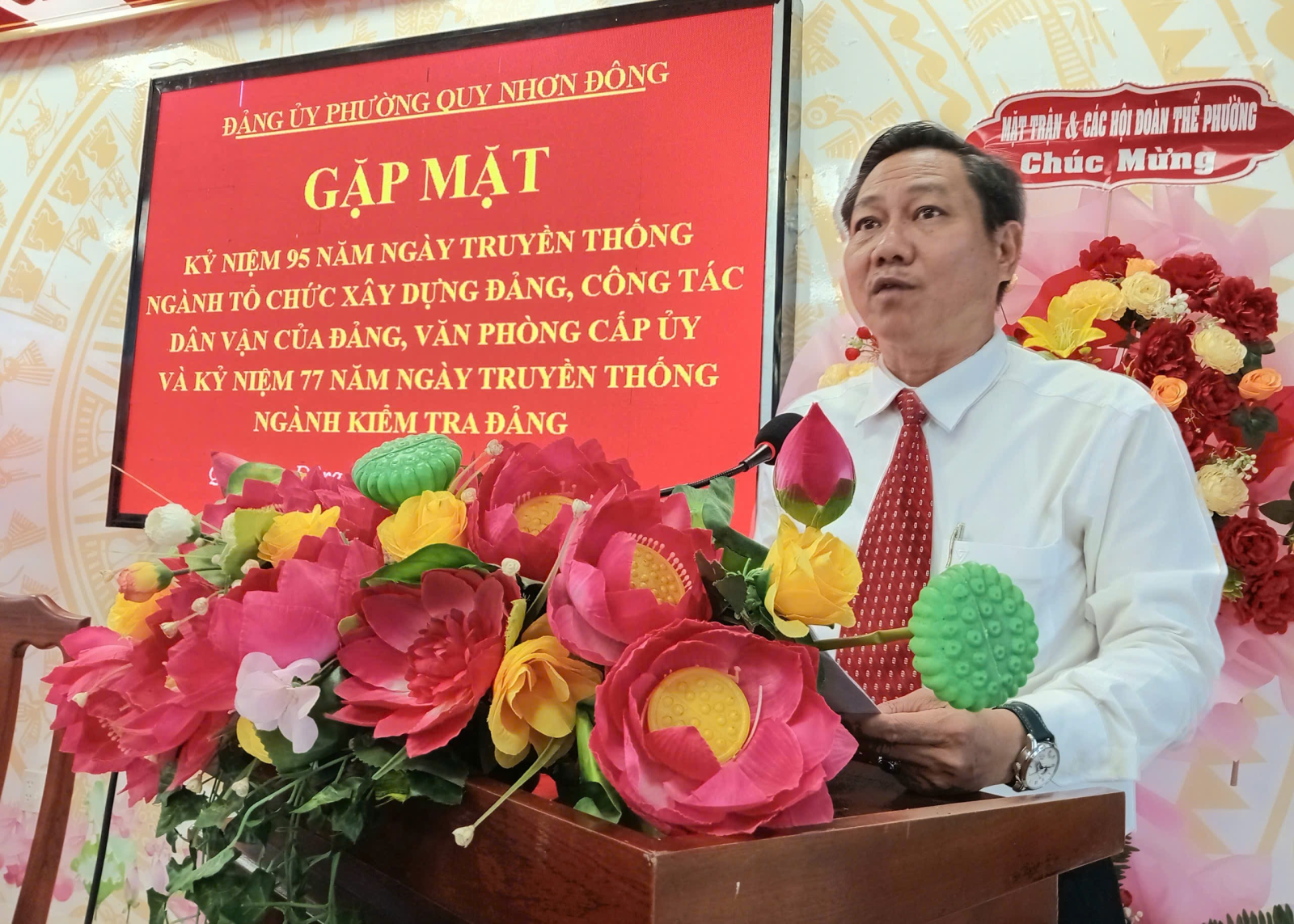 Tại buổi gặp mặt, đồng chí Đỗ Văn Định - Phó Bí thư Thường trực Đảng ủy phường phát biểu ôn lại truyền thống xây dựng và phát triển của ngành Tuyên giáo, tổ chức Xây dựng Đảng, công tác Dân vận của Đảng, Văn phòng cấp ủy và ngành Kiểm tra Đảng.